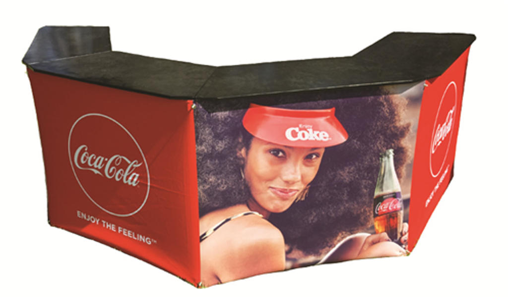This booth is suitable for 3-4 people at any one time. Durable, quick to set up and easy to store. Available with 3, 4 sides. Excellent for a variety of uses including a Pop Up Shop, Serving platform, Bar, Information desk or Ticket station.