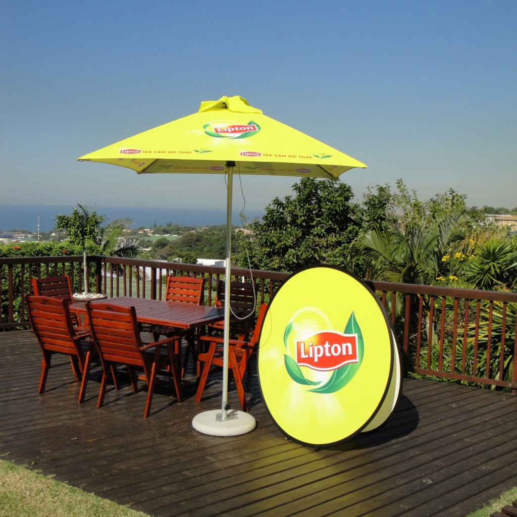 Our parasols utilize a specialized UV printing process that is changing the world of digital printing Not only is UV ink environmentally friendly, as it does not release VOCs (Volatile Organic Compounds) into the atmosphere, but it also ensures long-lasting, vibrant print that radically improves the outdoor lifespan. Our high quality UV print on heavy duty fabric makes us a forerunner in this new era of outdoor branding. The Parasol has an octagonal anodized aluminum pole making it durable and stable. The Parasol Pole can be supplied as a fixed peice or as a collapsible unit. The option allows the bottom half of the pole to slide inside the top half of the pole, making the product easier to handle and transport. Supplied with a slip cover to protect the product in transit and storage. Concrete Bases and attachments are sold separately.